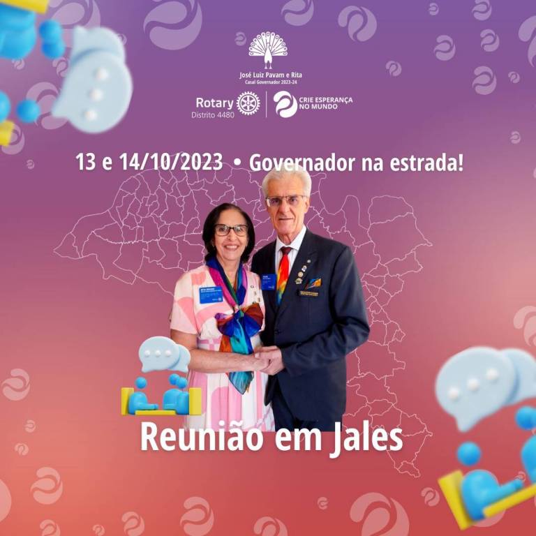 Na parte superior central na cor branca: imagem de um pavão, abaixo: José Luis Pavam e Rita - casal Gov.2023/24. Seguindo abaixo o logo do distrito e o lema crie esperança no mundo. Ao centro o casal Gov. Rita e Pavam.