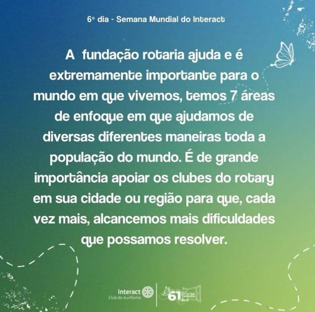 Um card em tons de azul acima e verde abaixo, trás em letras finas brancas acima 6º dia - Semana Mundial do Interact. Logo abaixo em linhas finas formando um quadro temos uma borboleta branca no canto esquerdo do quadro. Uma linha pontilhada faz um zigzag nas laterais do quadro. Ao centro do quadro uma imagem desfocada de borboleta e as palavras: Rotary leva esperança. Abaixo fora do quadro o símbolo em branco do Interact Club de Auriflama e um símbolo de programa de Interact .