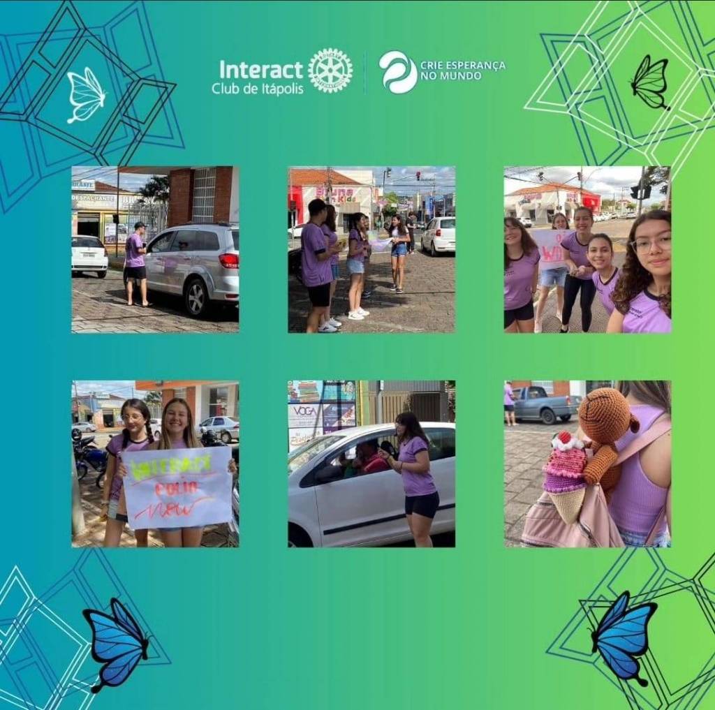 1 card em cores de azul e verde trás abaixo centralizada uma foto de vários jovens entre meninos e meninas sorridentes vestindo camisetas lilás. Por todo o card desenhos de finos traços lembrando janelas aberta, estrelinhas e borboletas estão espalhadas por todo espaço. No centro acima em branco o símbolo do Interact Club de Itápolis e ao lado o símbolo da gestão atual. Abaixo o número 61 grande em branco com uma borboleta azul ao lado esquerdo e do lado direto a palavra anos, seguida de um lar que transborda SMI. Seguindo abaixo em letras pretas Dia 6 O Rotary Leva Esperança