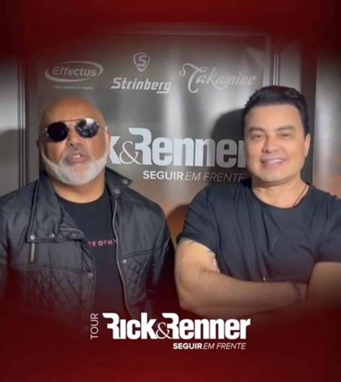 Audiodescrição: Cantores Rick e Renner aparecem em uma imagem de show, entre imagens de natal, e informam que no dia 18 de novembro vão estar no evento de Sonho de Natal em Santa Fé do Sul, fazendo um super Show.