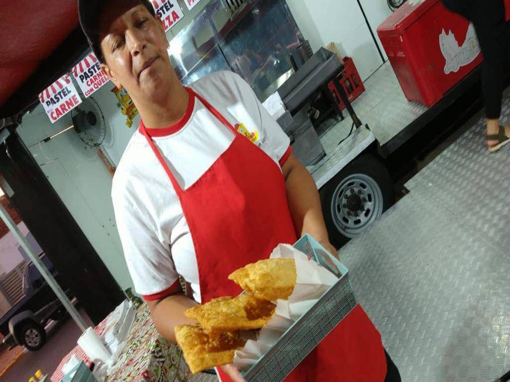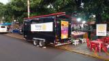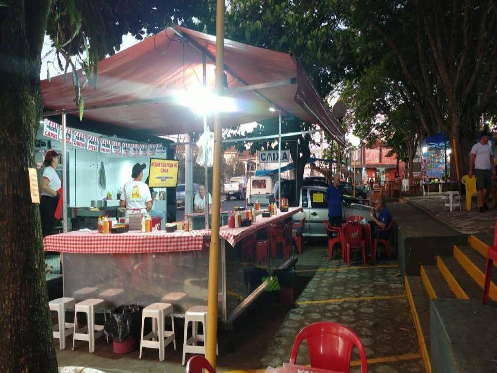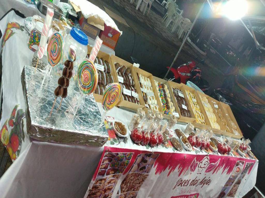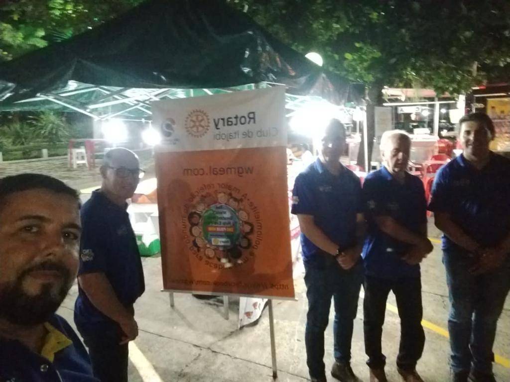 Audiodescrição: na foto, identificação de uma barraca de doces, montada ao ar livre como se fosse em uma feira livre. Algumas mesas vermelhas empilhadas e cadeiras ao fundo com mesas montadas. Arvores de fundo, luzes, pessoas circulando, uma mulher na barraca de doces, um banner na frente da barraca com simbolo do Rotary Club de Itajobi e do crie esperança no mundo, abaixo: wgmeal.com e um circulos de crianças em volta do desenho do planeta terra. Em volta das crianças, A maior refeição do mundo para acabar com a poliomielite. No rodapé, https://www.facebook.com/wgmeal.
