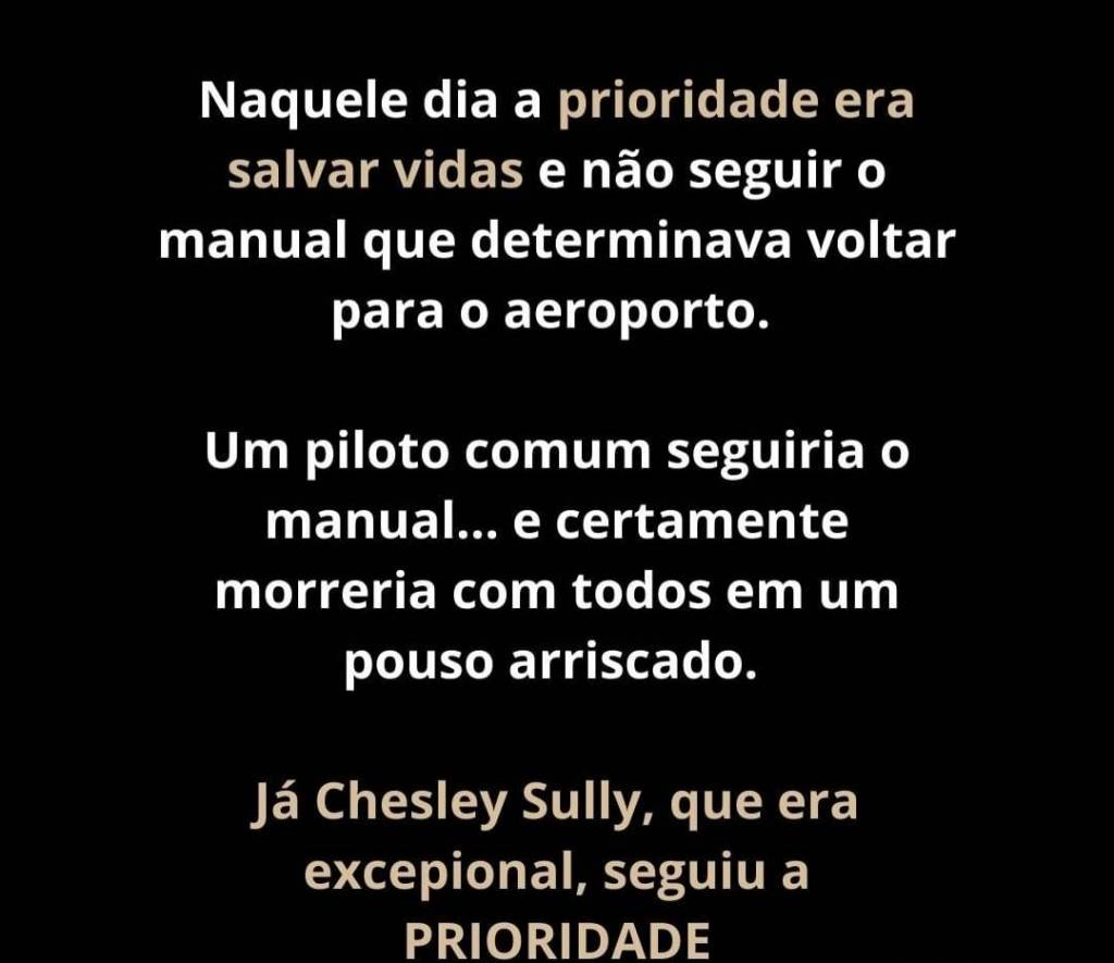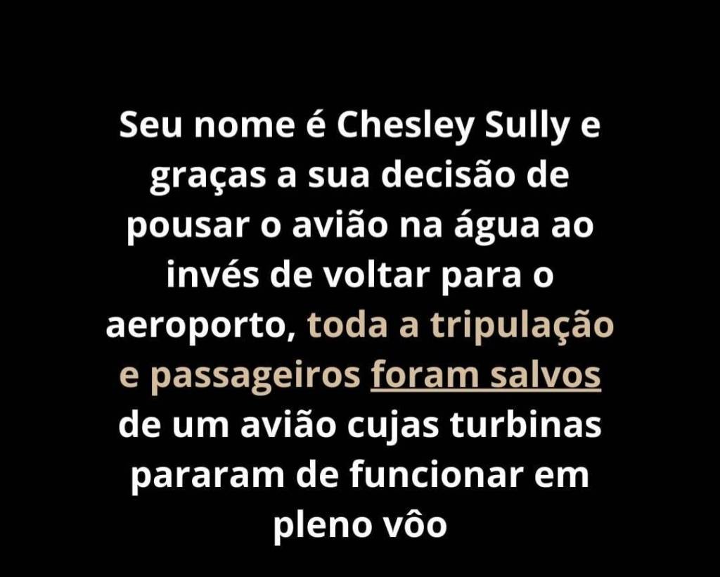 Audiodescrição: no card, de fundo preto, do lado direito a imagem de um senhor grisalho, de bigode, usa terno e sorri. Ao lado esquerdo da sua imagem, descrito: Acredite, esse simpático senhor foi o piloto responsável por essa proeza, que ficou conhecida como o milagre do Rio Hudson. Após, setas indicando continuação da narrativa no próximo card.