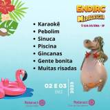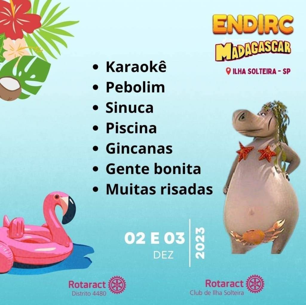 Audiodescrição: no card, de fundo azul clarinho, ao lado direito no topo: ENDIRC MADAGASCAR, simbolo de localização Ilha Solteira-SP. No centro, desenho de um sol, envolto por folhas de coqueiro, coco, flores, escrito Festa Luau. Do lado esquerdo mais abaixo, um cisne inflável na cor rosa e ao centro, 02 e 03 dez/2023 e ao lado direito, uma bola colorida. No rodapé simbolos do Rotaract Distrito 4480 e Rotaract Club de Ilha Solteira.