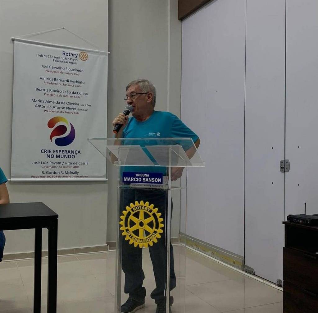 Audiodescrição: no card de fundo, ao centro, Reunião 09/11 Interact. No rodapé, simbolos do Interact Club de São Jose do Rio Preto Palácio das Águas e do lema crie esperança no mundo.