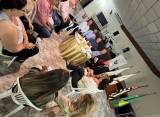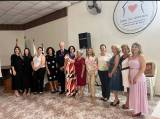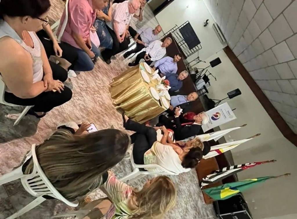 6 homens e 6 mulheres em traje social sentados em cadeiras em torno de uma pequena mesa com uma toalha dourada, 6 jogos de pratos e talheres com um arranjo de flores no centro. Ao fundo vemos um banner da gestão ao lado de bandeiras penduradas em um pavilhão. No canto superior direito da foto vemos um palco com pedestais, caixas de som e equipamentos de áudio.