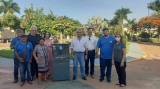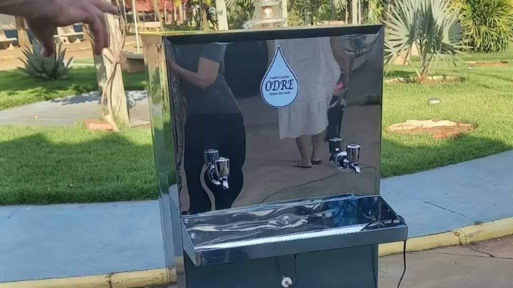 Em um ambiente aberto, ensolarado e de muitas plantas verdes, o casal Gov. Pavam e Rita está acompanhado de várias pessoas entre homens e mulheres que pousam para a foto trazendo no centro um grande bebedouro elétrico na cor cromada.
