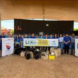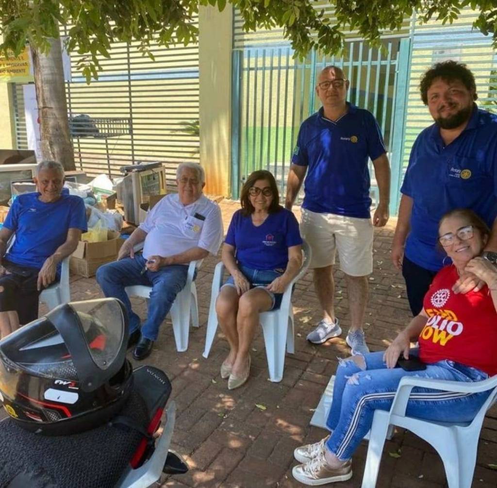 Foto de um ambiente amplo e aberto, porém, com uma cobertura permanente. Vemos 16 pessoas, entre homens e mulheres nas mais variadas faixa etárias. 2 pessoas da lateral esquerda seguram um banner da atual gestão rotária, enquanto 7 pessoas no centro da foto seguram uma faixa da campanha do lixo eletrônico. No chão, logo a frente das pessoas, vemos caixas de papelão e equipamentos eletrônicos variados, incluindo televisores antigos e gabinetes de computadores. Ao fundo se destaca um palco com a parede pintada de preto, sendo possível ver estabelecimentos comerciais da cidade ao fundo.