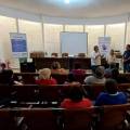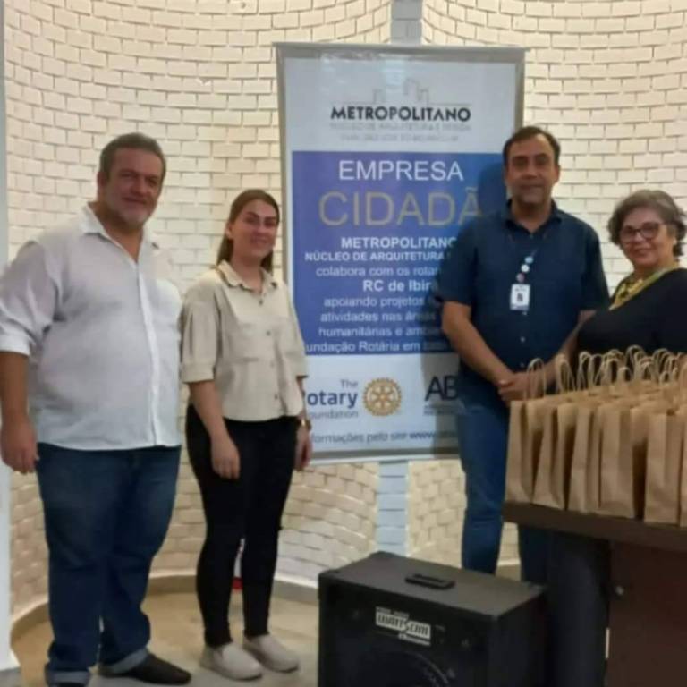 4 pessoas identificadas na foto dúvidas em pares. A primeira pessoa da esquerda é um homem de barba e cabelos grisalhos aparados, veste camisa branca com as mangas dobradas e calça jeans azul, ao seu lado, uma moça com cabelos longos e lisos, com camisa creme e calça preta. Ao seu lado, um homem alto, cabelos penteados, veste uma camisa e uma calça jeans, ambos azuis, é possível identificar um crachá nesse homem. Na ponta direita vemos uma moça de óculos, cabelos curtos castanho médio. Usa uma camisa azul com gola amarela. Na frente das 2 pessoas da direita há uma mesa com várias sacolas de papel, entre os 2 pares, vemos um banner branco com um quadrado azul ocupando boa parte da arte da empresa cidadã Metropolitano. Ao fundo, parede com tijolos aparentes pintada de beje.