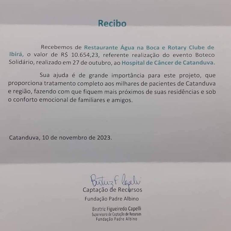 No dia de ontem, 13 de novembro, o Rotary Club de Ibirá teve a honra de receber o Sr. Júlio Cesar Luiz, gerente de captação de recursos do Hospital do Câncer de Catanduva. Na ocasião foram repassados R$ 10.654,23 (dez mil seiscentos e cinquenta e quatro reais e vinte e três centavos); valor este que foi angariado através do evento: "BOTECO SOLIDÁRIO", realizado pelo Rotary Club de Ibirá e com parceria com o Restaurante Água na Boca. Durante a reunião, o Sr. Júlio entregou ao Pres. Thiago Azevedo Simplício da Silva o Recibo de Doação e agradeceu imensamente a todos que colaboraram para que esse evento fosse um sucesso, destacando também a importância do trabalho de conscientização e apoio à saúde realizado pelo Rotary no mundo todo.