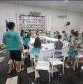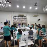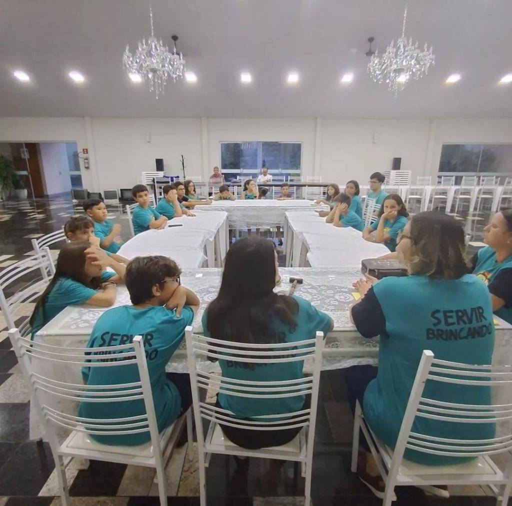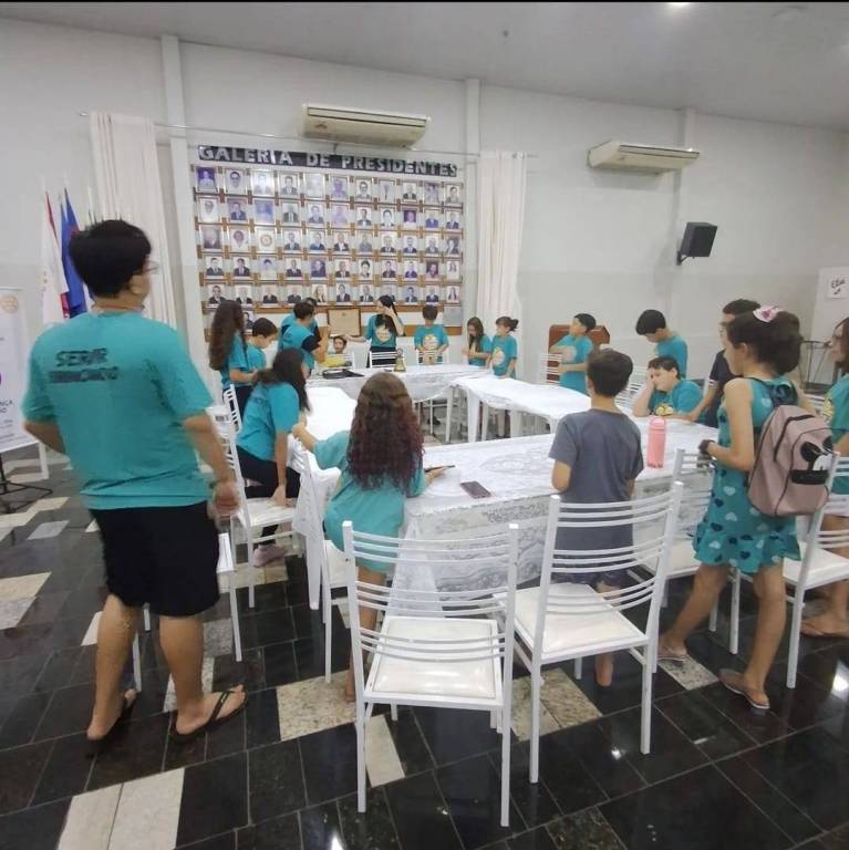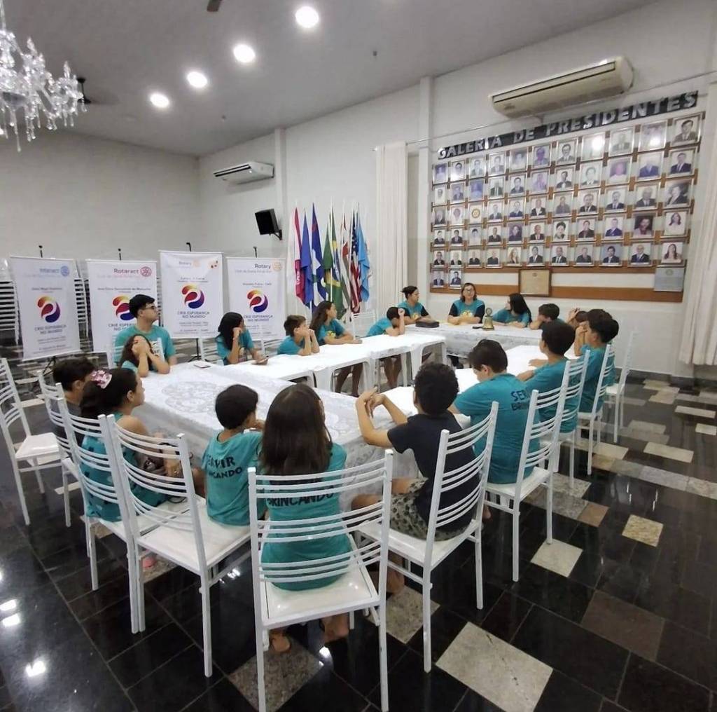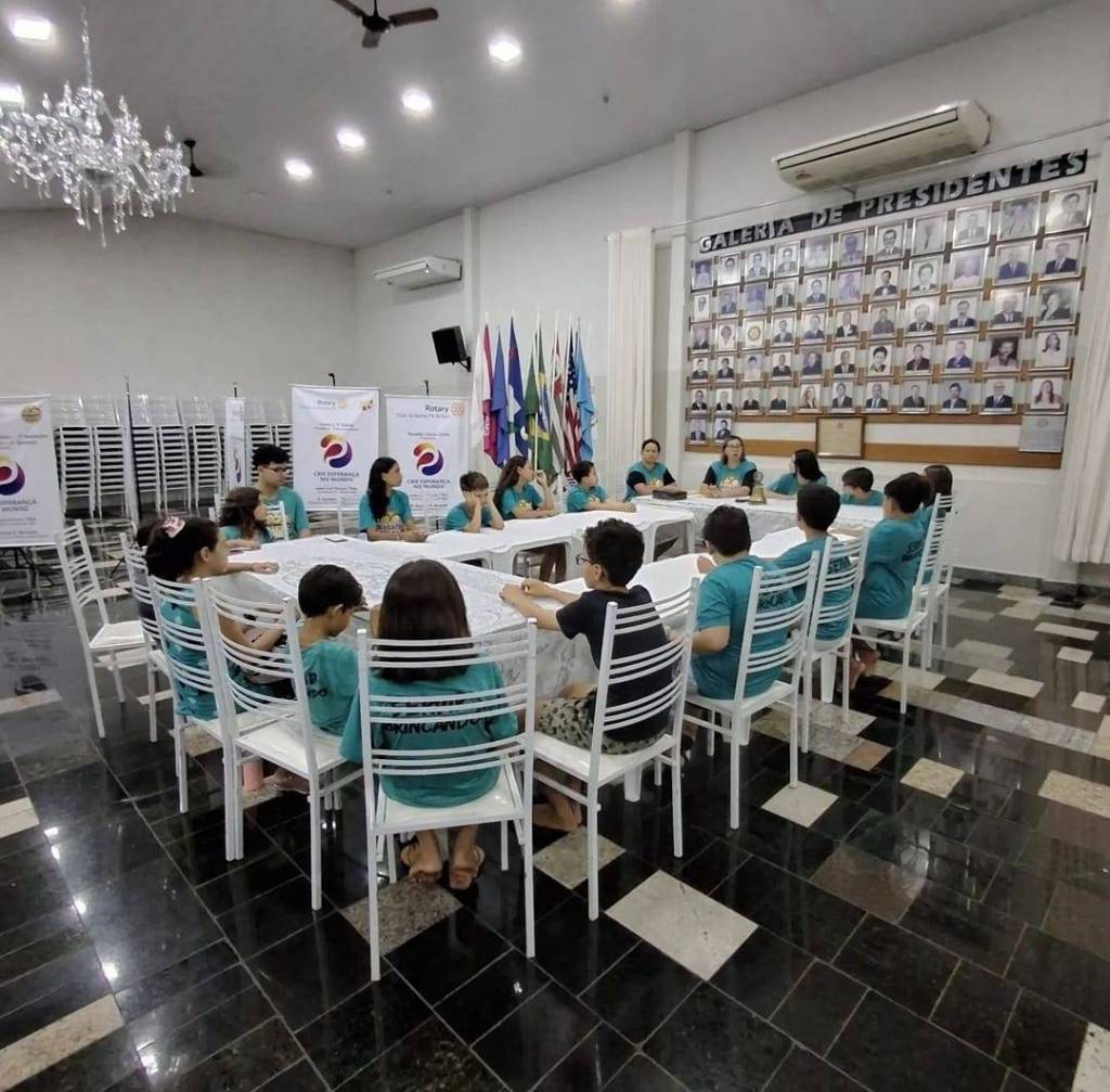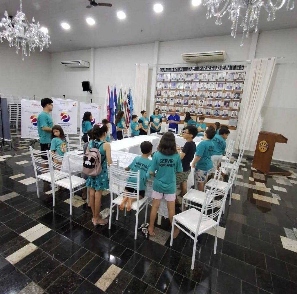 Foto de um salão amplo e claro, com o teto alto e paredes brancas e chão escuro, vemos várias crianças sentadas em uma série de mesas com toalhas brancas unidas formando um círculo. A maioria veste camiseta verde azulada. Ao fundo, no centro da foto vemos alguns adultos orientando as crianças. No fundo, do lado esquerdo, vemos banners da atual gestão do Rotary com cadeiras de plástico empilhadas, no teto é possível ver um lustre, um ventilador de teto preto e várias luzes acesas. Na parede atrás dos adultos, vemos uma caixa de som pendurada na parede, 2 aparelhos de ar condicionado, um mural de fotos dos Presidentes do clube.