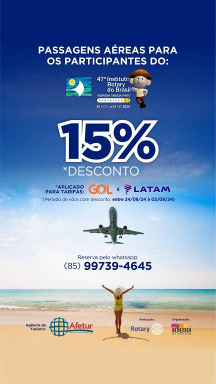 Um card com imagem de uma praia com areias claras, mar tons de verde e azul e céu azul. Na parte azul do céu escrito em letras brancas: passagens aéreas para os participantes do: 47° Instituto Rotary Brasil - Agerson Tabosa Pinto. Fortaleza - Ceará 29 de agosto a 1° setembro de 2024. Essas informações estão entre um símbolo em desenho de uma jangada no mar com um sol do lado esquerdo e um boneco nordestino do lado direito. Bem no centro em letras grandes destacadas 15 % desconto. Abaixo as informações: * aplicado para tarifas Gol e Latam, * período de voos com desconto: entre 24/08/2924 à 03/09/2924. Logo abaixo a imagem de um avião levantando voo. Na sequência: reserva pelo wattsap (85)99739-4645. No final bem no centro com pés na areia uma mulher de trajes de banho e chapéu na cabeça com os braços abertos contempla o cenário . Abaixo os símbolos da Agência de turismo Afetur, realização do Rotary e organização Ideia Eventos.
