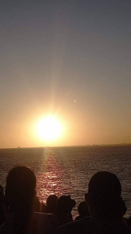 A imagem nos mostra um lindo por do sol observado por várias pessoas não identificadas pois estão de costas e numa perspectiva escura. O sol está se despedindo nas margens de águas tranquilas.