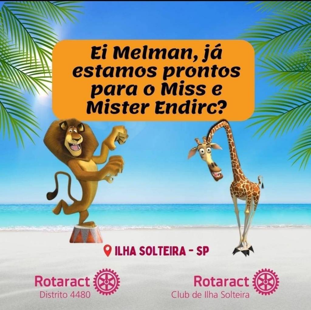 1 card com a imagem de uma praia em desenho animado com areia branca, mar e céu azul. Acima nas laterais esquerda e direita folhagens verdes. No centro acima escrito em letras grandes no degradê do amarelo para o laranja: Endirc. Logo abaixo bem pequeno em branco a imagem de uma pessoa sentada em meia lua com uma vara de pescar nas mãos e ao lado a palavra DreamWorks. Na sequência abaixo em letras amarelas lembrando o movimento de uma onda a palavra Madagascar . Bem no meio do card em uma caixa vermelha as informações em letras brancas: contagem regressiva 13 dias. Abaixo em vermelho marcado de amarelo 02 e 03 de dezembro de 2023. Na sequência um símbolo de localização digital e Ilha Solteira - SP. Abaixo na lateral esquerda o símbolo do Rotaract Distrito 4480 e na lateral direta o símbolo do Rotaract Club de Ilha Solteira, ambos em cor vinho.