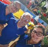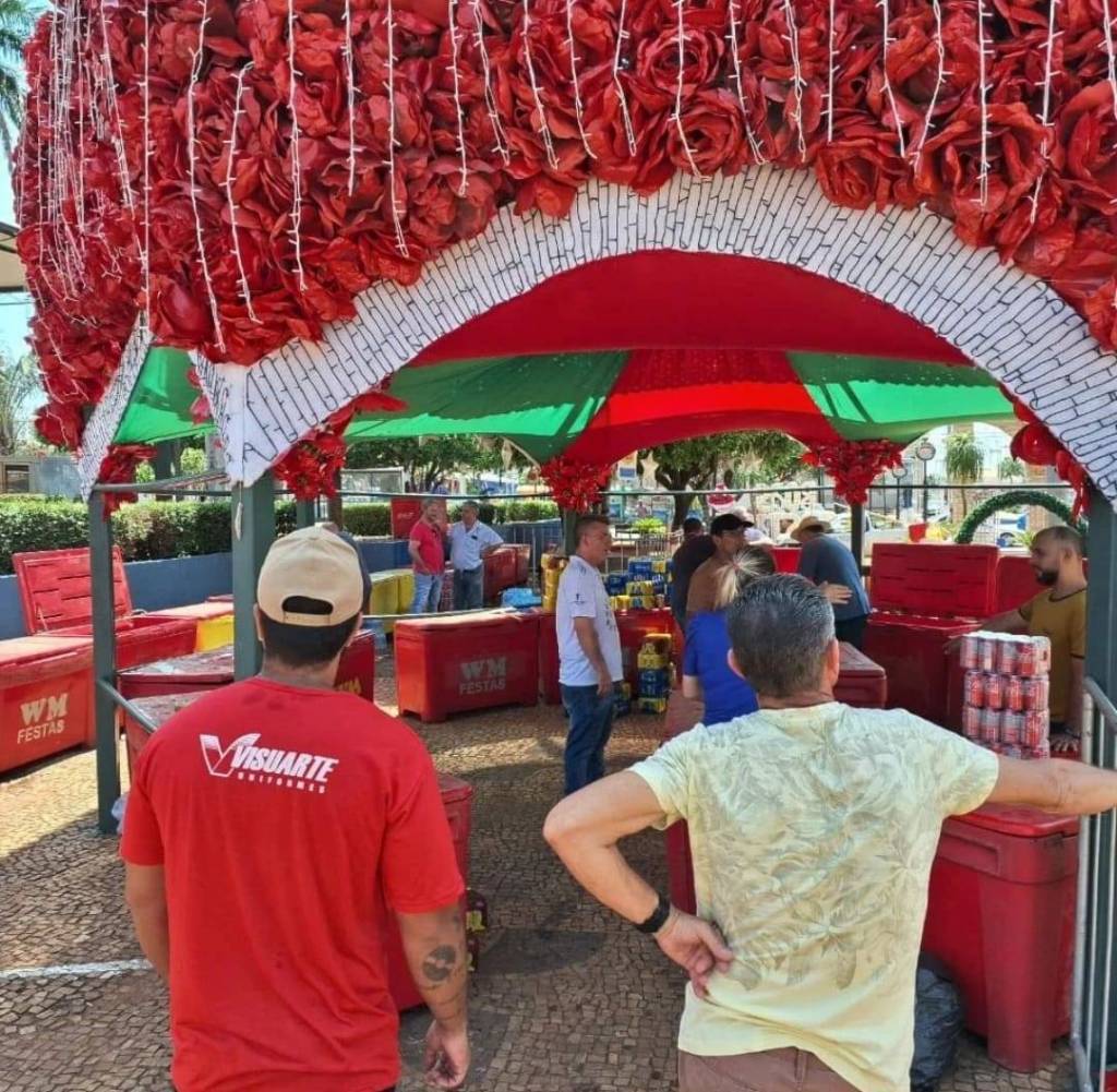 Audiodescrição: na foto, identificação de algumas pessoas sentadas, comendo e bebendo algo ao fundo, uma barraca com identificação de Rotary Club. Dentro da barracada temos uma geladeira e bebidas, um tonel de chopp e também uma geladeira convencional, e algumas pessoas usando toca, atendendo clientes.