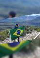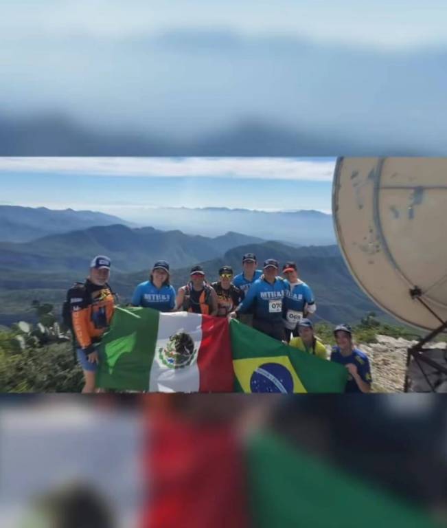 Audiodescrição: na foto, 6 pessoas sorridentes, equipadas com roupas e equipamentos de caminhadas, usando bone, no fundo duas das pessoas se cobrem com a bandeira do Brasil, ao fundo uma estrada de terra e vegetação.