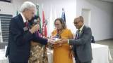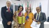4 pessoas detectadas na foto. Do lado direito o casal Gov Pavam e Rita, ele de terno escuro com camisa branca e usando óculos. Ela de vestido longo estampado. Presenteiam com um mimo um casal também vestidos elegantemente: ele de terno cinza, camisa branca e também de óculos. Ela de vestido amarelo com echarpe no pescoço e usando óculos. O ambiente é fechado, iluminado e atrás uma grande mesa branca e um pavilhão de bandeiras. Ao fundo uma porta branca fechada do lado direito e do lado esquerdo uma porta também fechada de ferro com vidro escuro.