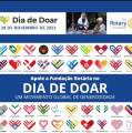 Um card com faixa acima azul, logo abaixo do centro para a direita uma foto desfocada de 3 mulheres confraternizando. Do lado direto da foto a logo da Fundação Rotária e do lado esquerdo um coração estilizado em verde e amarelo com Dia de Doar 28 de novembro de 2023.