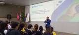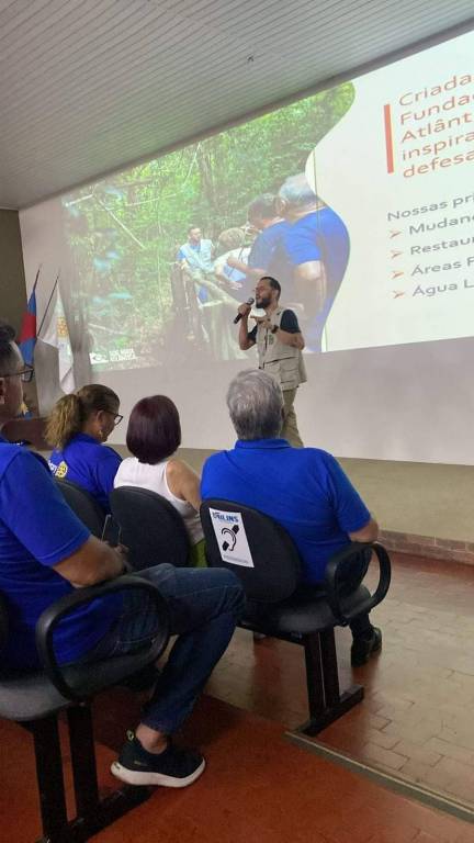 Audiodescrição: na foto, algumas pessoas sentadas em uma plateia, de frente para um rapaz, em cima de um palco, falando ao microfone, atrás dele um telão com imagem de pessoas em meio a uma mata, em cima do que parece ser uma ponte de madeira. Do lado esquerdo do palco, pavilhão de bandeiras.