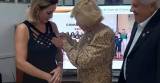 Audiodescrição: na foto, 4 pessoas identificadas, na ponta da direita o Gov. Pavam, segura uma almofada com a foto dele e da sua esposa. Do lado dele, um rapaz de terno, bom barba cumprida, segura um presente, do lado desse rapaz, uma moça loira, de vestido e lenço colorido, e ao lado dela, a Rita, esposa do Gov. segura um presente. No fundo, fotos de antigos presidentes.
