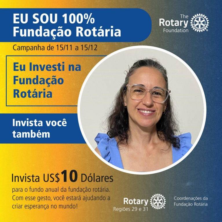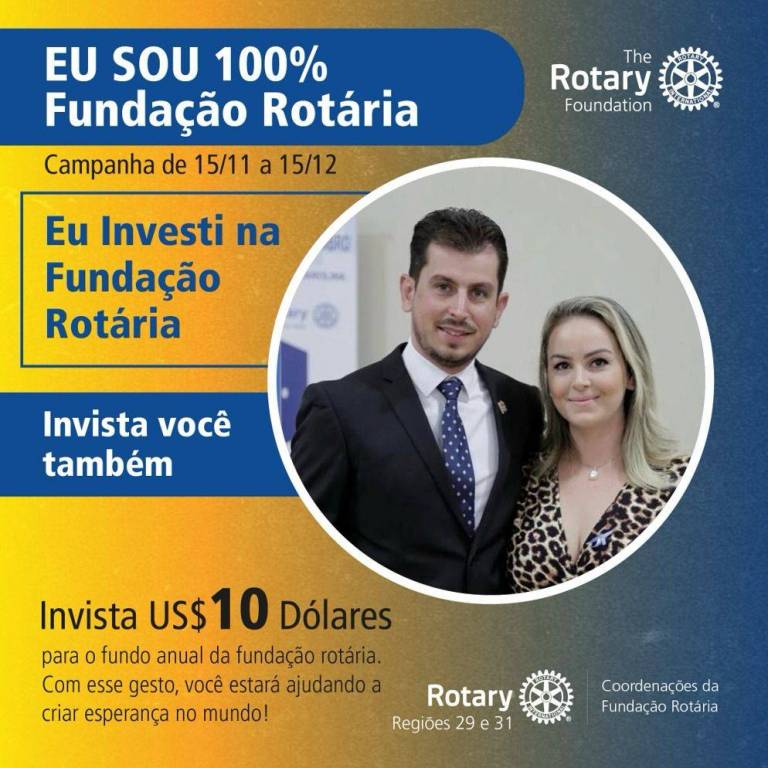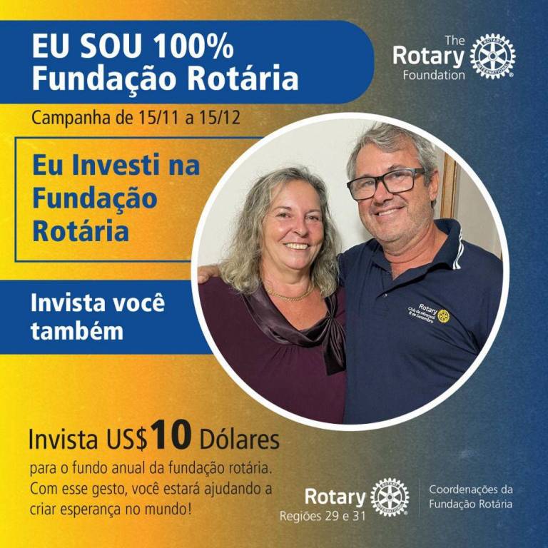 No card de fundo degradê do amarelo para o azul, no destaque em faixa larga azul escrito em letras brancas: Eu sou 100% Fundação Rotária. Abaixo em letras finas azuis Campanha 15/11 a 15/12. Ao lado o símbolo da Fundação Rotária em branco. Abaixo em uma esfera com o símbolo do Rotary Club de Mirassol 8 de Setembro, e ao lado em letras azuis Eu investi na Fundação Rotária. Logo abaixo Invista você também. Seguindo abaixo: invista U$$ 10 dólares para o fundo anual da fundação rotária. Com esse gesto você estará abundando a criar esperança no mundo.
