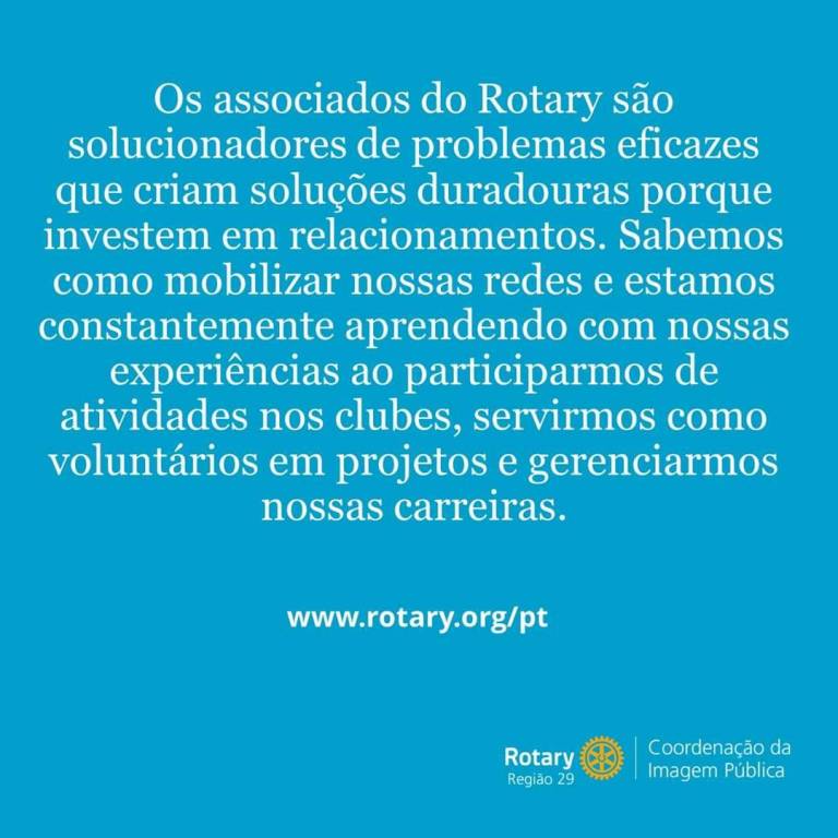 Os associados do Rotary são solucionadores de problemas eficazes que criam soluções duradouras porque investem em relacionamentos. Sabemos como mobilizar nossas redes e estamos constantemente aprendendo com nossas experiências ao participarmos de atividades nos clubes, servimos como voluntários em projetos e gerenciarmos nossas carreiras.