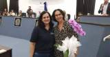 Foto do interior da Câmara Municipal de Votuporanga, onde observamos as mesas dedicadas aos vereadores ocupadas por pessoas sentadas, bem como os assentos destinados ao público ao fundo. Observamos 2 mulheres sentadas na mesa da presidência da câmara, de frente para o público. É possível identificar 3 bicicletas na lateral direita da foto. Ao fundo observamos 4 janelas grandes no lado esquerdo e um mesanino sobre a porta de entrada da câmara.