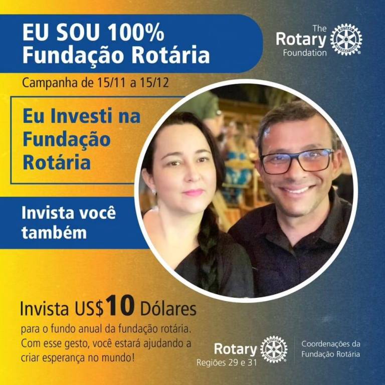 No mês da Fundação Rotária estamos renovando nosso compromisso em Fazer o bem no Mundo por meio de um *investimento de Us$10,00 para o Fundo Anual*.
