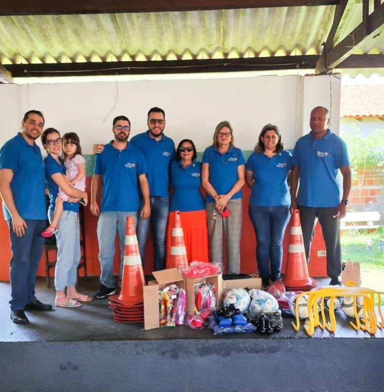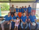 Na foto identificamos várias pessoas entre homens e mulheres todos usando camiseta azul do Rotary. A segunda mulher da esquerda para a direita segura uma criança no colo.