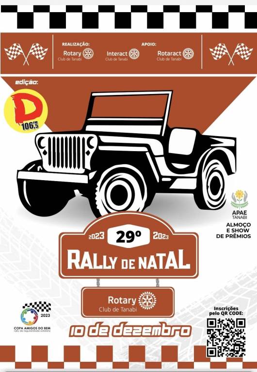 Audiodescrição: Card Branco com marcas de pneus em cinza e um grande triângulo laranja da parte de cima ao centro da imagem, terminando em um desenho de um jeep ao centro. Abaixo do jeep há uma placa em laranja com as letras em branco. É possível ler duas vezes o ano de 2023 emoldurando um hexagono assimétrico de cor branca contendo em preto o escrito 29º, com o nome do evento Rally de Natal abaixo também em branco. Abaixo da placa temos um retângulo com as pontas arredondadas possuindo em seu interior o logo do Rotary Club de Tanabi, com as letras e a Roda Rotária em branco. Abaixo do logo temos a data 10 de dezembro. Emoldurando na parte superior e interior temos listras quadriculadas, a de cima em preto e branco e a de baixo em laranja e branco. Na parte superior abaixo da moldura temos 2 bandeiras quadriculadas com as hastes cruzando, o desenho se repete do lado direito e do lado esquerdo. Entre as bandeiras há a mensagem de Realização com os logos do Rotary Club e do Interact Club de Tanabi, com o apoio do Rotaract Club de Tanabi. Abaixo das bandeiras cruzadas do lado esquerdo á um circulo amarelo com uma letra "D" em vermelho com a identificação 106,5FM. Abaixo temos o logo 2023 da Copa Amigos do Bem - Rally de regularidade solidário, representando 5 pessoas abraçadas, cada uma com 1 cor no sentido horário azul escuro, vermelho, amarelo, azul claro e verde. Na lateral direita temos o logo da APAE de Tanabi, contendo uma flor amarela com caule e folhas em verdes, amparados por um par de mãos e uma coroa de flores abaixo com os dizeres Almoço e show de prêmios. No canto inferior direito temos um QR Code em preto com os dizeres - Inscrições pelo QR Code.
