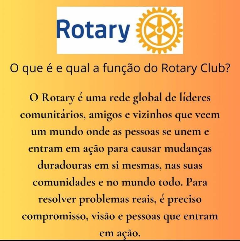 Audiodescrição: no card, de fundo degradê em amarelo e laranja, no topo, desenho da roda rotária em amarelo e escrito Rotary em azul. Abaixo: O que é e qual a função do Rotary Club? O Rotary é uma rede global de líderes comunitários, amigos e vizinhos que veem um mundo onde as pessoas se unem e entram em ação para causar mudanças duradouras em si mesmas, nas suas comunidades e no mundo todo. Para resolver problemas reais, é preciso compromisso, visão e pessoas que entram em ação.