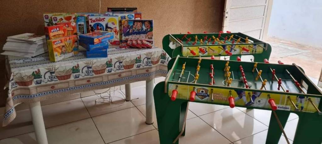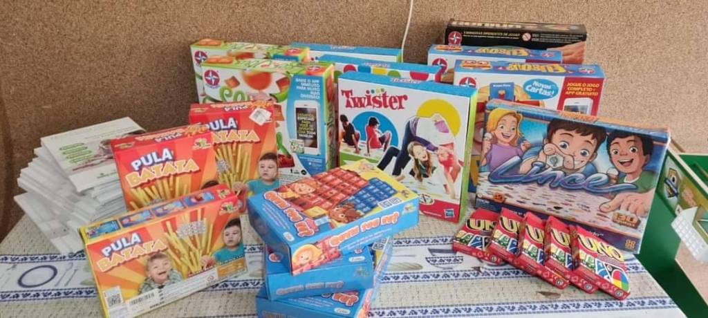 Audiodescrição: na foto, várias pessoas identificadas, estão todas de frente, sorridentes, entre elas alguns brinquedos e mesa de jogo de futebol de botão. Na parede, quadros infantis.