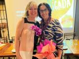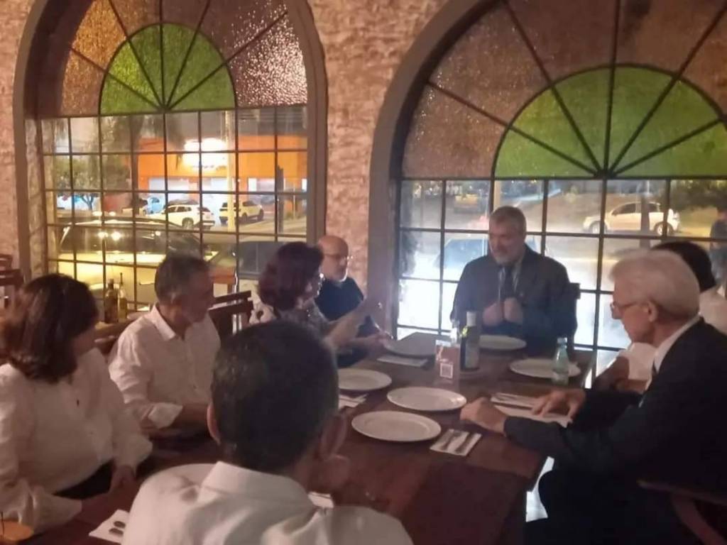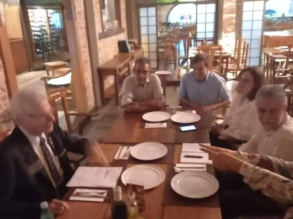 Audiodescrição: na foto 9 pessoas identificadas, das quais, 7 estão em pé, abraçadas entre si, e os outros dois, sentados, é o casal Gov. Pavan e Rita. Atrás e todos temos um telão e ao lado uma mesa cm pratos.
