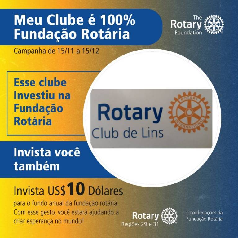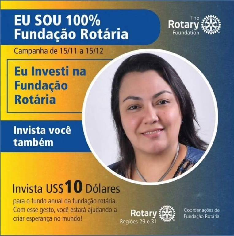 No mês da Fundação Rotária estamos renovando nosso compromisso em Fazer o bem no Mundo por meio de um investimento de Us$10,00 para o Fundo Anual.