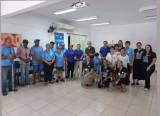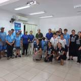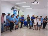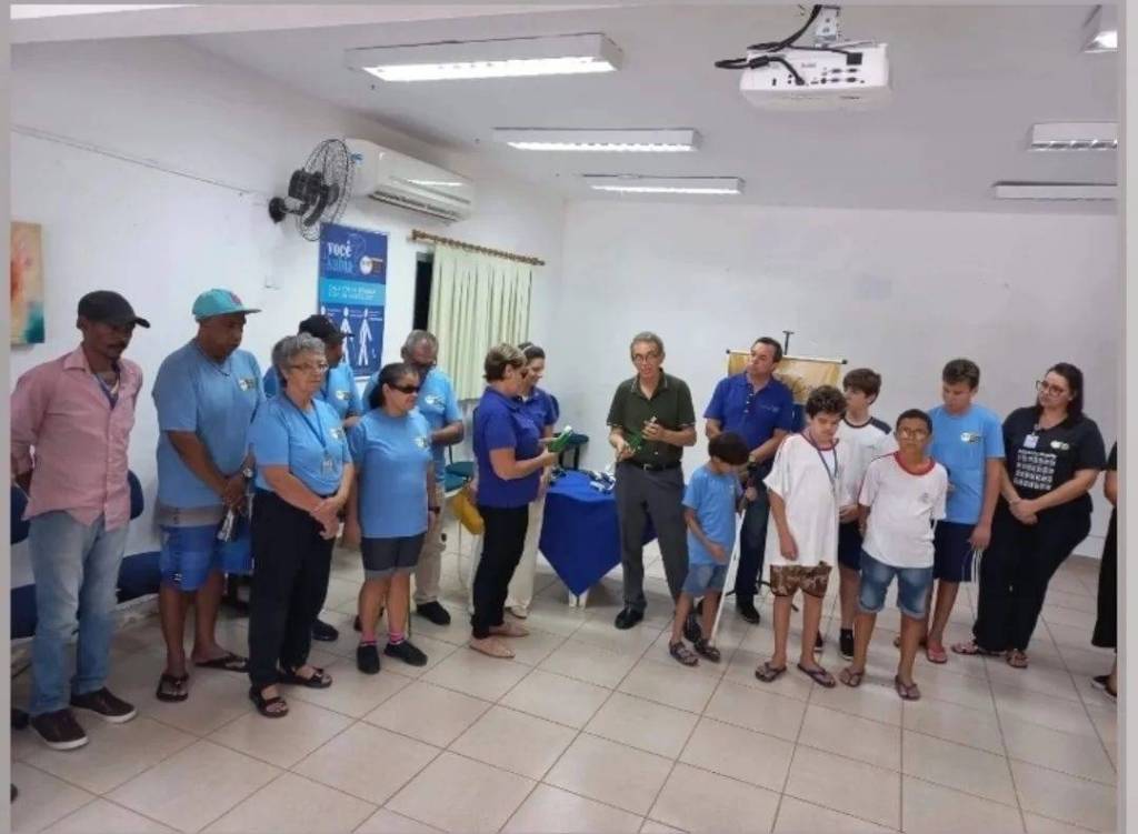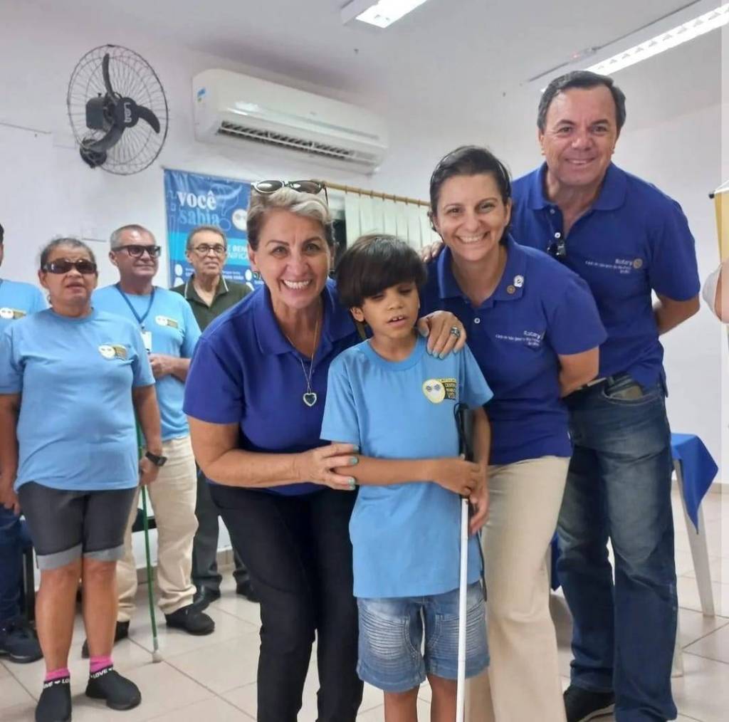 Audiodescrição: na foto, algumas pessoas em pé, usando camiseta azul do Rotary, m senhor no meio delas, segurando algo na mão, usa camiseta verde, atras de todos uma mesa, cortina persiana na janela, ar condicionado na parede e na frente 3 crianças, uma com bengala e as outras do lado.