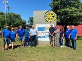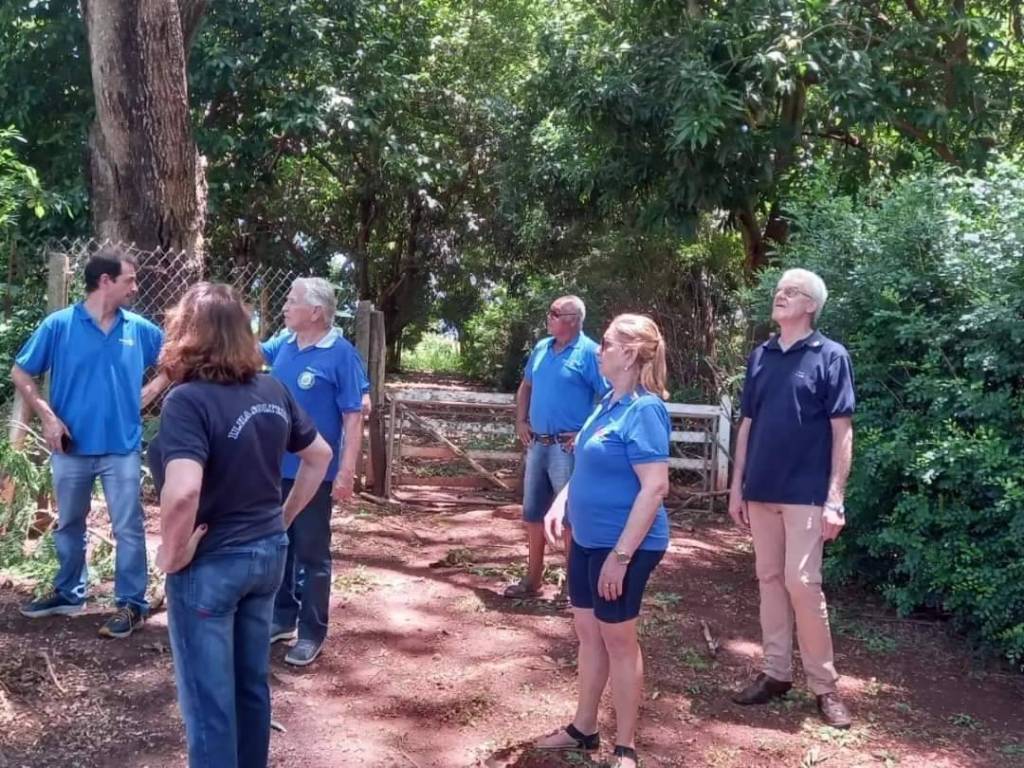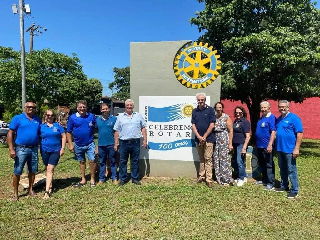 Várias pessoas entre homens e mulheres detectados na foto, inclusive o casal Gov Pavam e Rita. É dia e o ambiente é aberto e de campo com várias árvores grandes atrás das pessoas. Todos estão vestidos de maneira esporte, a maioria de camiseta azul do Rotary. Em meio às pessoas um grande marco rotário com um a roda rotária acima à direita e o desenho da bandeira celebremos Rotary 100 anos centralizada.