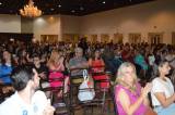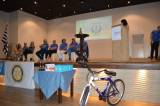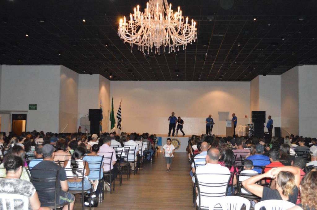 Audiodescrição: na foto, um auditório repleto de pessoas sentadas de frente para o palco. No palco, um rapaz em pé em frente a uma tribuna e mais algumas pessoas sentadas em cadeiras plásticas. No centro, uma mesa estilo bistrô com sino rotário.