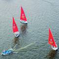Audiodescrição: na foto, três veleros em um rio, na vela, de cor vermelha, simbolo da roda rotária e a frase END POLIO NOW.