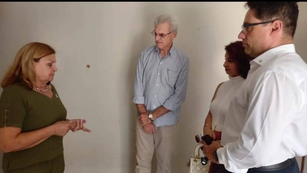 Audiodescrição: na foto, casal Governador lado direito e do lado deles uma moça e um rapaz, todos olham para foto e estão lado a lado, atrás se observa uma sala com quadro branco, cadeiras e luzes.