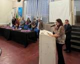 Ao lado direito temos uma mulher usando blusa estampada e calça escura, com cabelos escuros longos com um microfone na mão direta fazendo uma leitura em uma tribuna clara. Atrás da mulher um homem vestindo terno escuro ao lado de uma escada também escura.