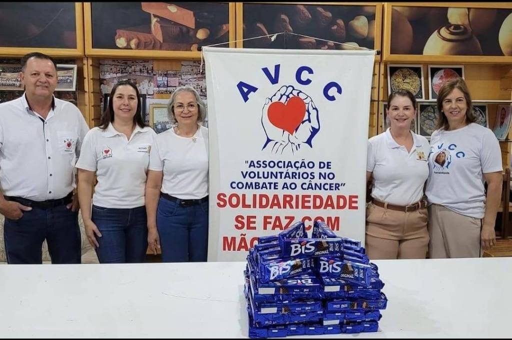 Em meio a eles um banner com fundo branco e a sigla: AVCC em letras azuis em meio círculo. Logo abaixo o desenho em linhas finas da silueta de 2 mãos segurando um coração vermelho e os dizeres logo abaixo em azul: “Associação de Voluntários no Combate ao Câncer. Abaixo em letras vermelhas uma frase que não conseguimos completar mas destacamos a palavra Solidariedade.
