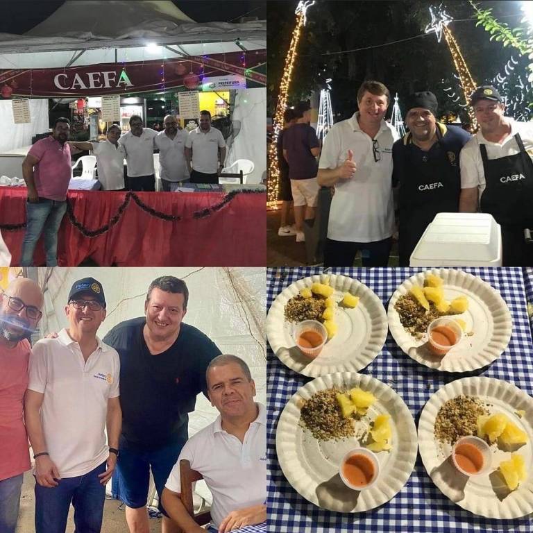 Quadro imagens, onde a primeira na parte superior esquerda: 4 homens de camiseta branca na parte de dentro de uma barraca escrito Caefa e lado de fora um homem de camiseta rosa. Todos abraçados entre si. Uma toalha vermelha cobre o balcão da barraca. Lado direito superior: 3 homens sorrindo, 2 com aventais da Caefa e 1 camiseta branca fazendo o sinal de jóia com a mão direita. Parte inferior esquerda: 3 homens em pé e um sentado, lado direito inferior: 4 pratos de papelão, com mandioca, molho e farofa sobre uma mesa xadrez de branco e azul.