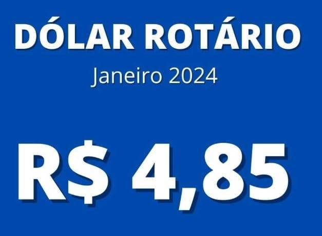 Áudiodescrição: Card azul com os dizeres em branco: Dólar Rotário, Janeiro 2024, R$4,85