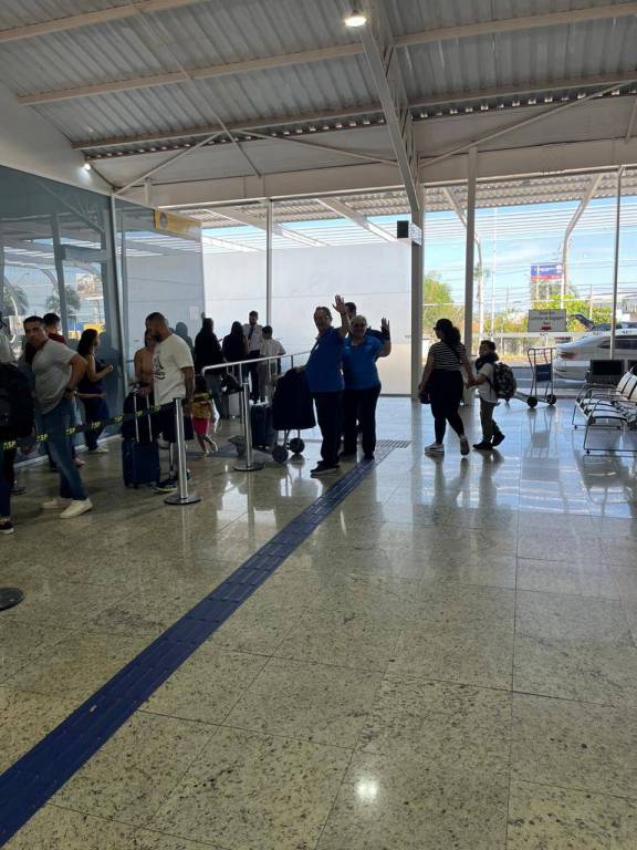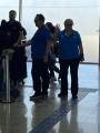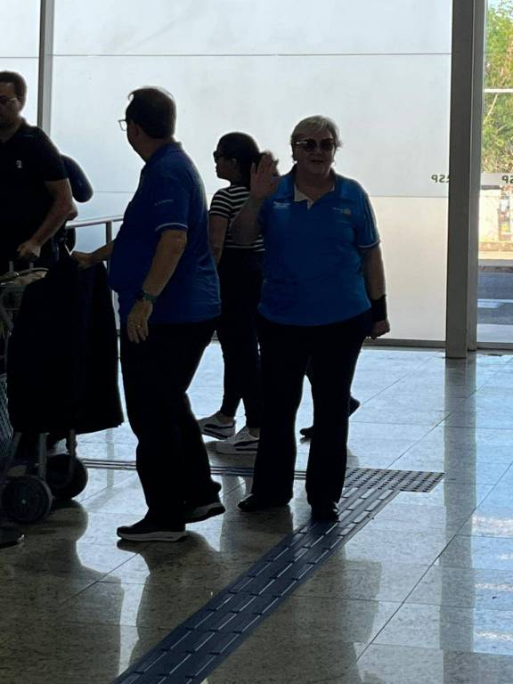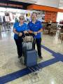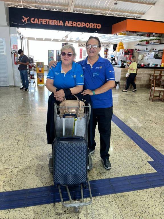 No centro atrás de um carrinho de bagagens de aeroporto destaca-se um casal vestindo camiseta azul do Rotary.