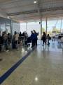 O local é fechado e iluminado com teto de ferragens branco, deixando claro ser uma praça de alimentação, pois atrás dos mesmos num letreiro preto em letras laranja temos um desenho de avião com os dizeres: cafeteria aeroporto.