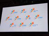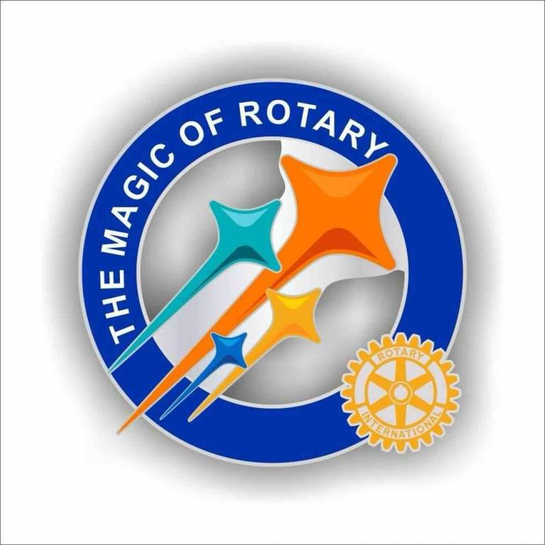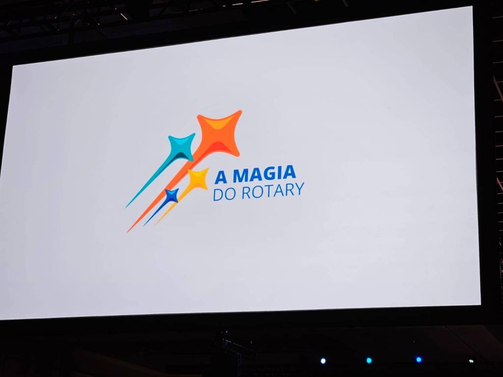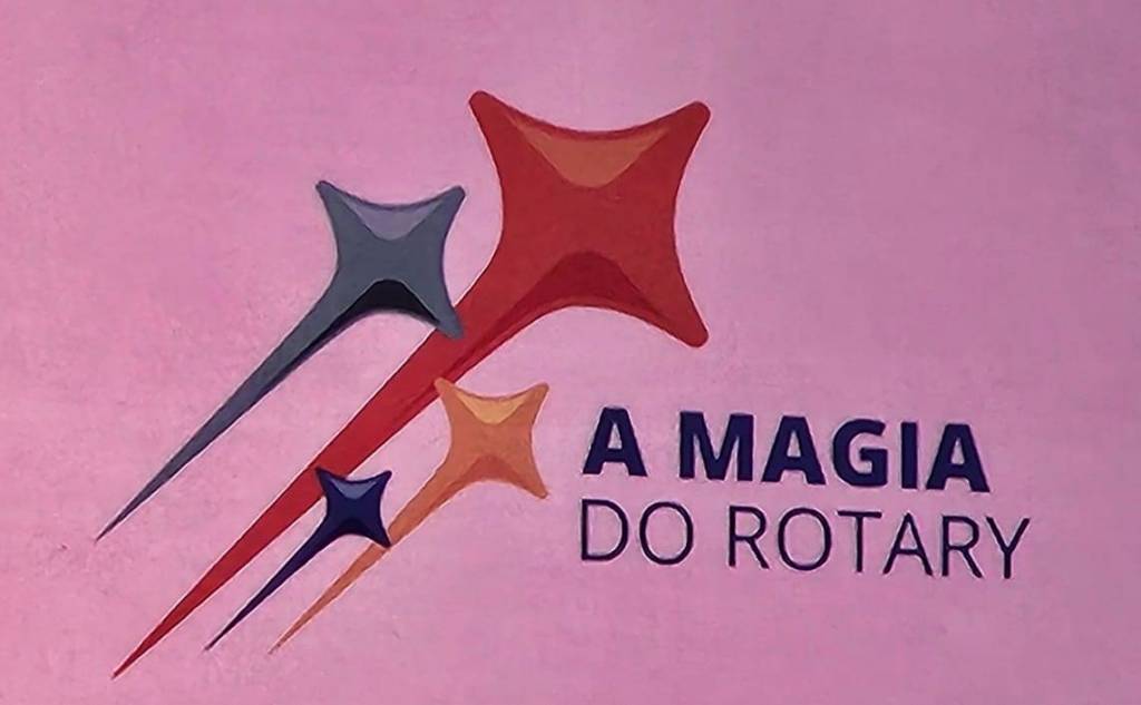 Bem no centro do card temos 4 estrelas cadentes estilizadas subindo da esquerda para a direita em cores diferentes: a menor azul, uma amarela, outra verde e a maior laranja. Ao lado das estrelas em letras azuis A Magia do Rotary.