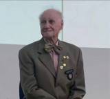 Na foto temos um senhor parcialmente calvo, sentado, vestindo terno verde oliva com camisa clara e gravata borboleta com vários botons na lapela do paletó.