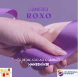 Acima no centro em letras roxas: Janeiro Roxo. Abaixo das mãos em letras brancas: mês dedicado ao combate à hanseníase.