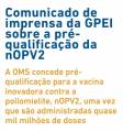 Um card fundo branco trás o seguinte em letras azuis: Comunicado de imprensa da GPEI sobre a pré - qualificação da nOPV2. Abaixo em letras laranja: A OMS concede para a vacina inovadora contra a Poliomielite, nOPV2, uma vez que são administradas quase mil milhões de doses.