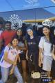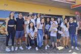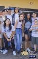 Posando para a foto varios jovens entre meninos e meninas vestidos de maneira esporte. Todos estão sorrindo. O lugar é aberto e podemos observar atrás deles a faxada toda em amarelo com portas em vidro do que parece ser um ponto de comércio.