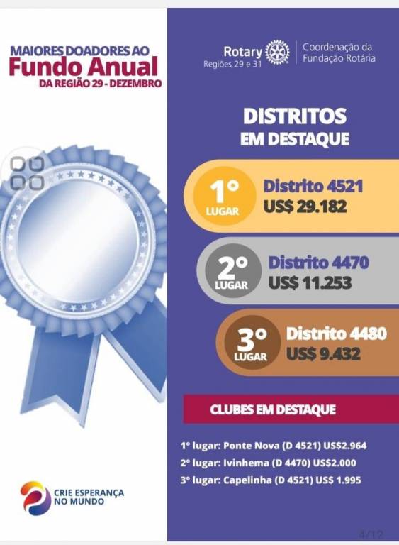 Do lado esquerdo o fundo é branco e trás a imagem de uma grande medalha nos tons de azul ao centro, acima temos os dizeres: maiores doadores ao Fundo Anual (no destaque em vermelho) da região 29 - Dezembro. Finalizando temos o símbolo e o lema da gestão atual: Crie Esperança no Mundo. Do lado direto o fundo é azul e trás o símbolo do Rotary regiões 29 e 31 Coordenação da Fundação Rotária. Abaixo: Distritos em Destaque